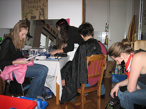 Kostym- och Maskförberedelser inför filmens första tagning. Piotr Giro (skådespelare), Susanna Bladh (smink & mask), Johanna Källström (smink & mask) och Elin R. Ganslandt (kostym).