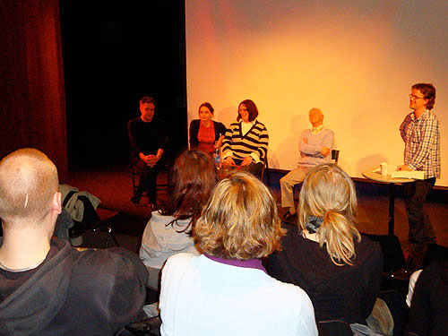 ![]() I panelen: Anders Lorentzon (verksamhetsledare Teatercentrums Östra region), Anna Wallander (skådespelare), Jenny Sjödin (RFHL Stockholm, f.d. hemlös), Reidar Persson (ordförande i föreningen Bygg Din Framtid). Diskussionsledare: Per Sternbeck (RFHL Stockholm). Debatten fortsätter. | |