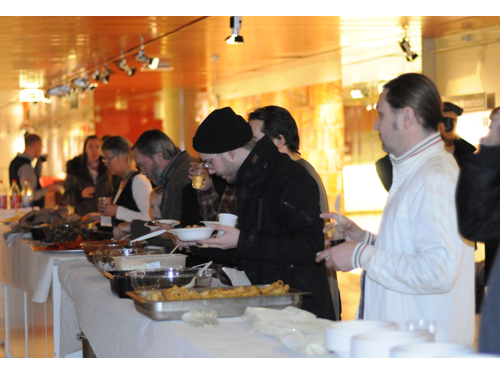 Mingel innan visningen. Publiken tar för sig av buffén.